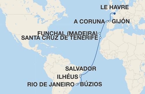 Le Havre, Gijón, A Coruna, Funchal, Santa Cruz de Tenerife, Salvador, Ilhéus, Búzios, Rio de Janeiro